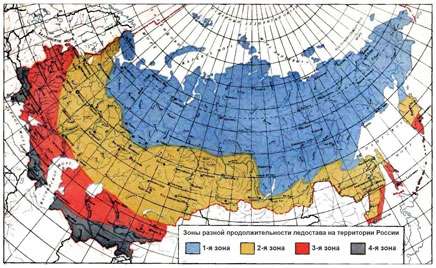 1-я зона (на карте выделена синим цветом) — зона особо длительного, с октября по май, ледостава.