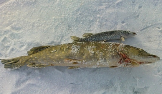 Я расставляю снасти на значительном удалении друг от друга, так как считаю, что таким образом я прочёсываю большую акваторию. Закончив с этим, отправился в машину, благо она недалеко буквально в трёхстах метрах, чайку уж горячего попить захотелось. На улице минус пятнадцать, для зимы это аномально тепло, если учитывать то, что я живу в не совсем тёплом регионе нашей страны. Так вот попив чаю, возвращаюсь и вижу такую картину. Из десяти жерлиц сработали восемь! В некотором шоке подбегаю к первой. Есть! Щука по прикидкам небольшая. Только вытащив одну, отправляюсь к другим и так далее. На двух жерлицах был сбит живец, а вот на остальных сидела щука! Но последняя из них меня обрадовала и повергла в изумление! Во время вываживания небольшого щуренка, его схватила щука килограмм на пять не меньше. Естественно её я не вытащил, в трофей достался огрызок от той мелкой. Руки естественно трясутся, насаживаю нового живца и опускаю в лунку.