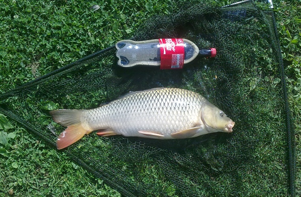 В 17:00 долгожданный писк сигнализатора и визг фрикциона. Паровоз! Подсечка! Стоявший рядом гость из свадебной компании, который оказался спиннингистом, с которым мы задушевно общались, уже на готове с подсаком. Спасибо Николай и карпик 3,5 кг на берегу. Теперь засекся четко за нижнюю губу. И снова левее пятна закорма. Верно было принято решение положить часть приманок слева от маркера, т.к. течение из-за ветра все же как оказалось сносило прикормку в сторону.